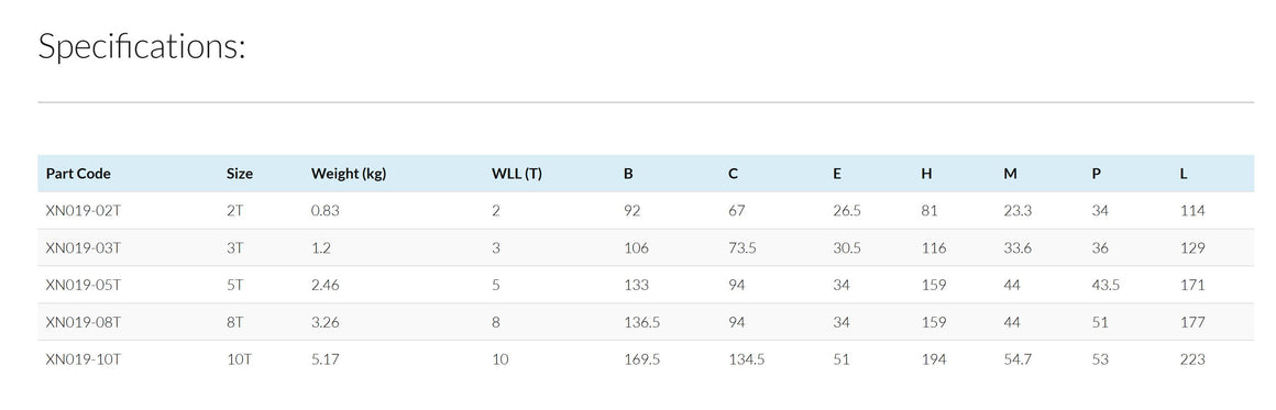 - Tapered hook design for easy engagement with chains, slings, or ropes